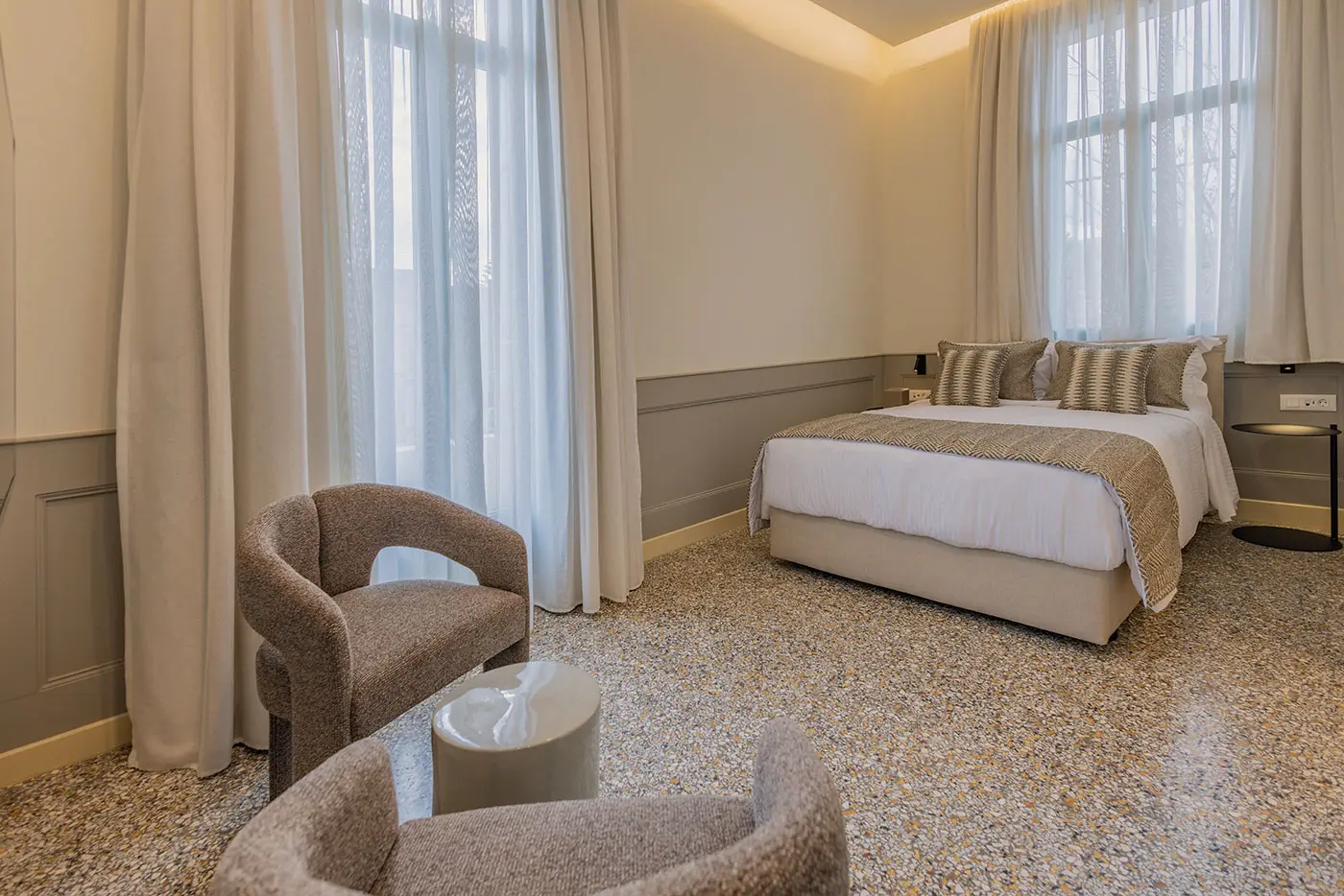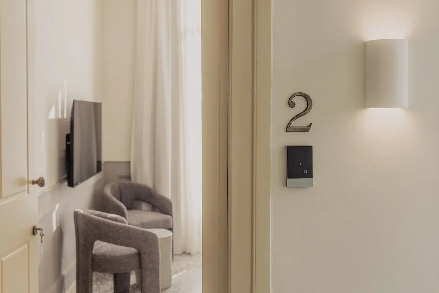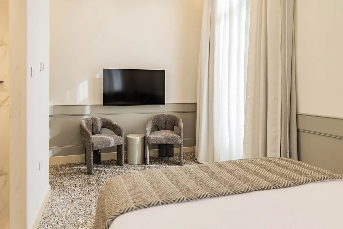 Safe depositMini BarAir ConditionHeatFanTowelsShowerAmenitiesWi FiSmart TV 55””Armchairs with table